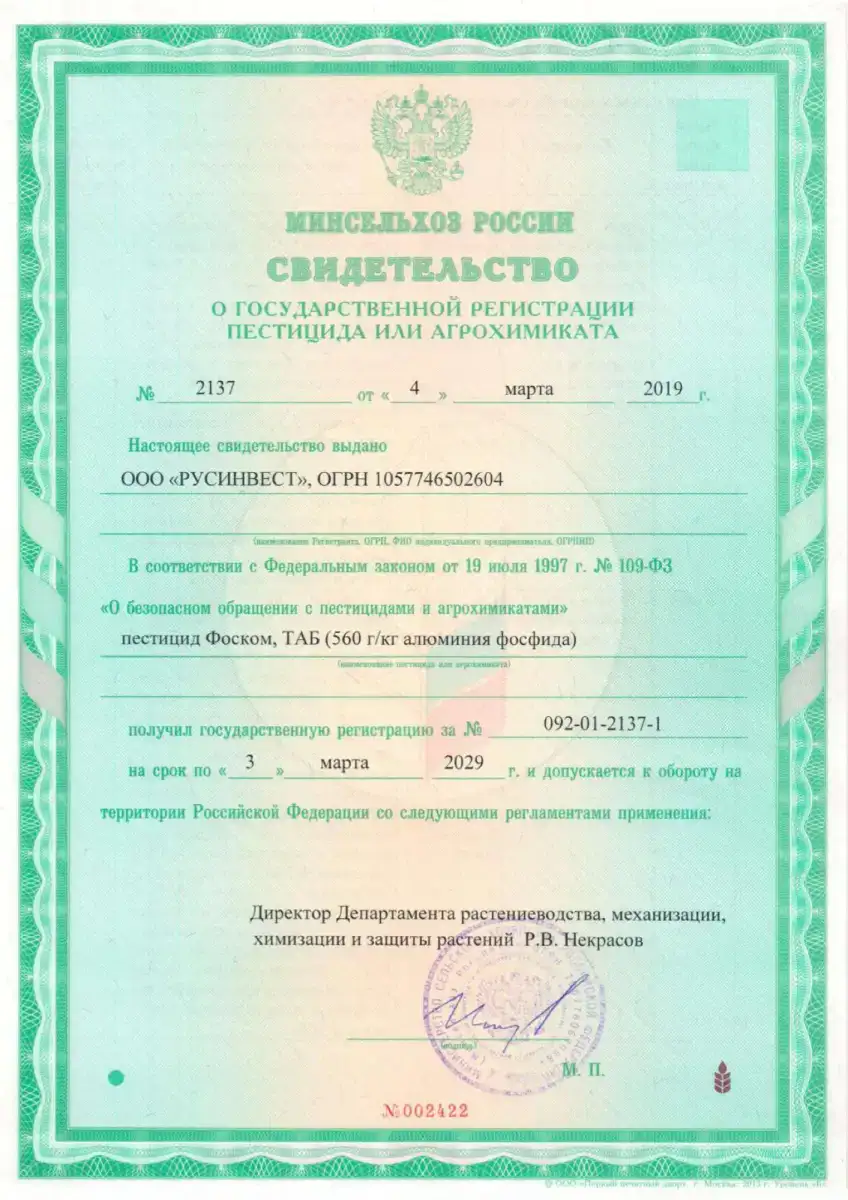 Наша компания закупает препараты только у официальных поставщиков — каждая партия средств для газации сопровождается свидетельством о государственной регистрации (СГР) и декларацией соответствия.