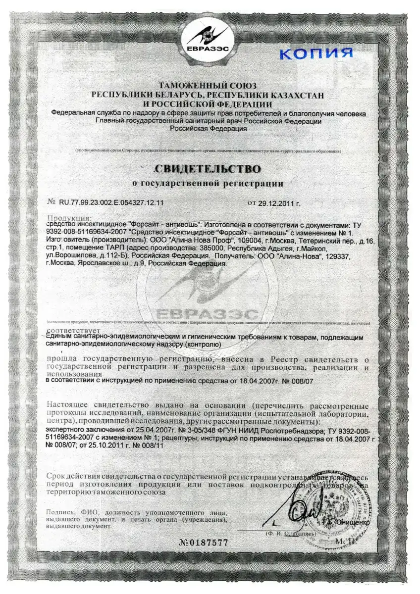 Наша компания работает только с официальными поставщиками инсектицидов и акарицидно-инсектицидных концентратов — каждая партия препаратов для дезинсекционной обработки очага сопровождается свидетельством о государственной регистрации.