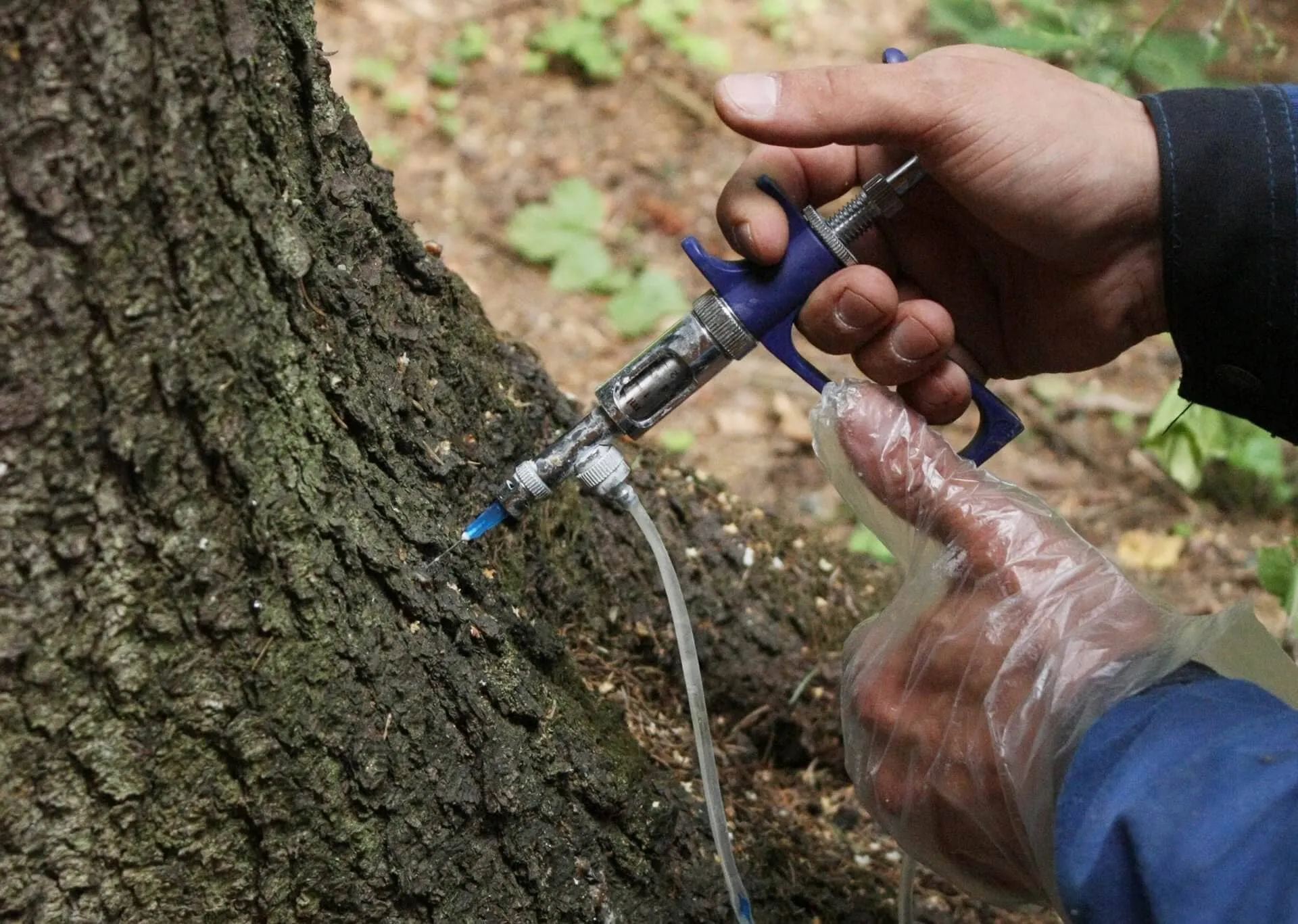 Владеем методом стволовых инъекций — препарат вводится в сосудистую систему и защищает дерево от короеда и грибковых заболеваний до трёх сезонов без повторных опрыскиваний.