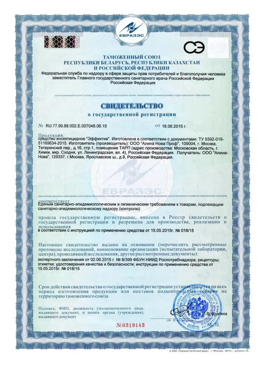 Все применяемые инсектициды на основе пиретроидов и фосфорорганических соединений имеют государственную регистрацию и разрешены для использования в жилых помещениях, безопасны для детей и домашних животных при соблюдении регламента по СанПиН 3.5.2.3472-17.