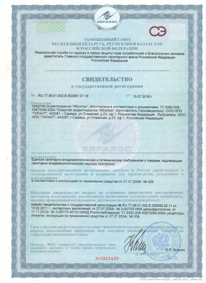 Оформляем акт дератизации, гарантийный талон и предоставляем сертификаты на препараты — полный пакет для Роспотребнадзора и управляющих компаний