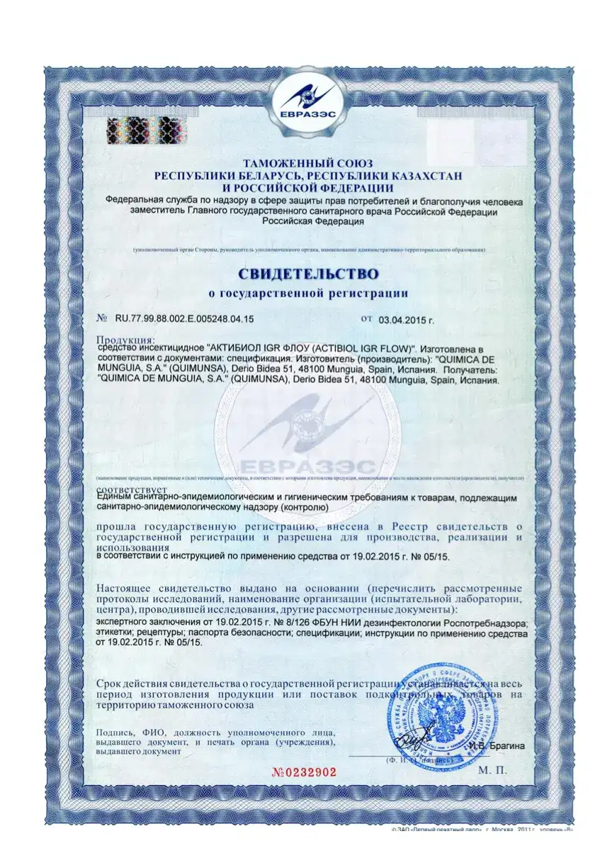 Компания работает только с официальными поставщиками: каждая партия препаратов контактного действия и регуляторов роста насекомых (IGR) сопровождается свидетельством о государственной регистрации (СГР).