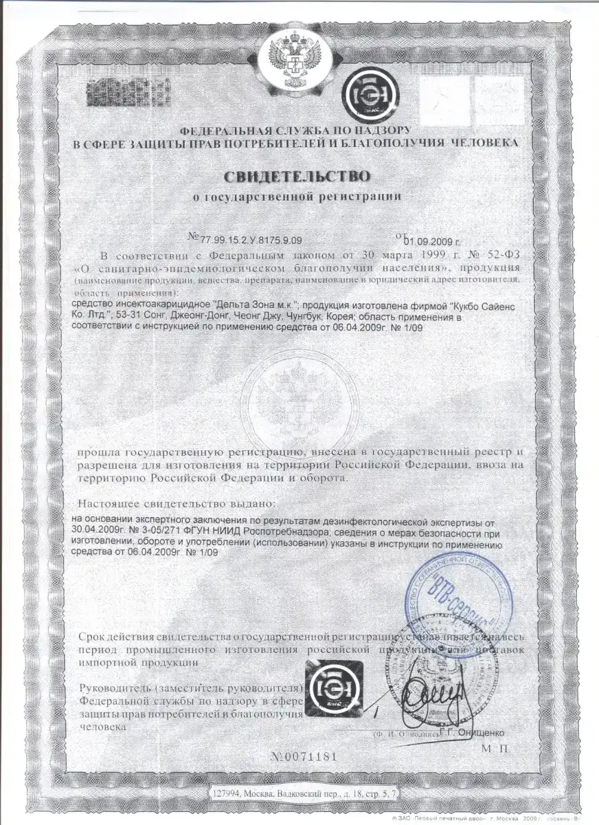 Наша компания работает только с официальными поставщиками сертифицированных препаратов — каждая партия средств для санитарной обработки сопровождается свидетельством о государственной регистрации и декларацией соответствия.