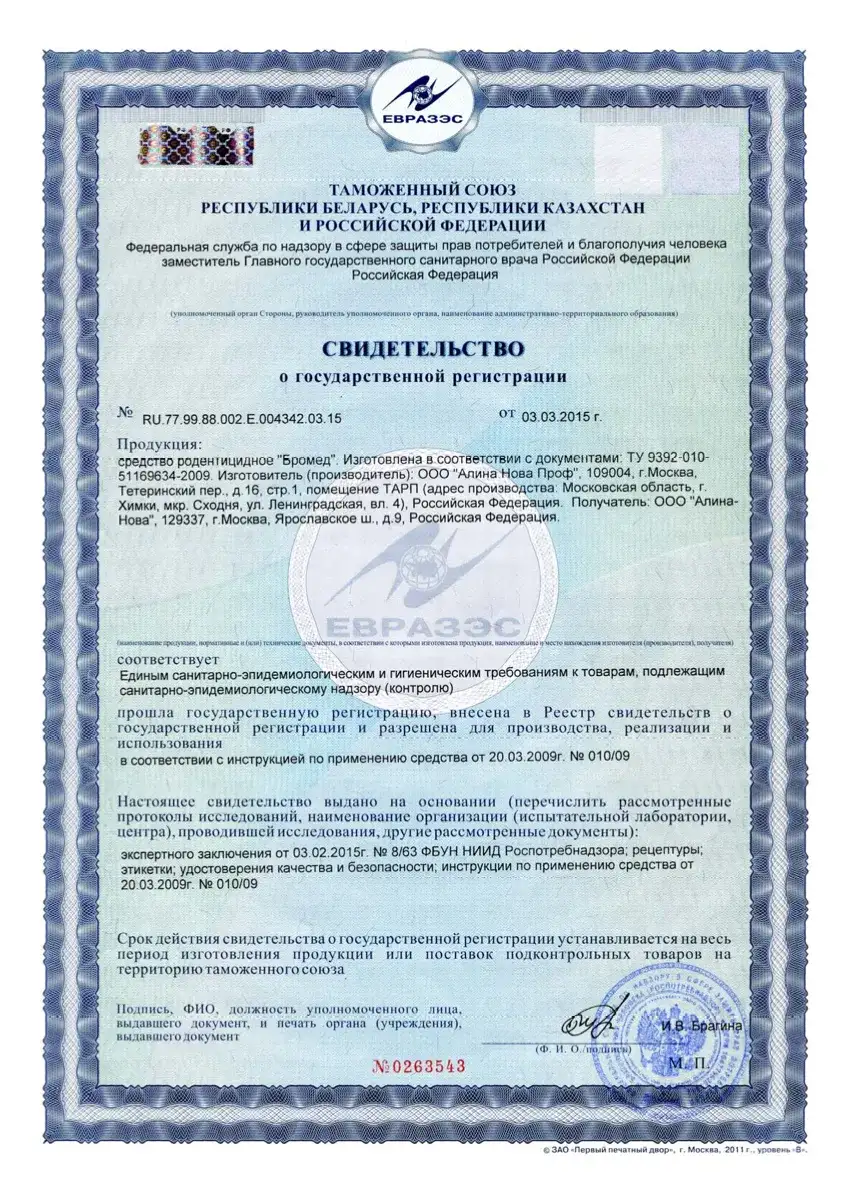 Компания работает только с официальными поставщиками — каждая партия серосодержащих репеллентов и родентицидов для дератизации кормовой базы сопровождается свидетельством о государственной регистрации (СГР).