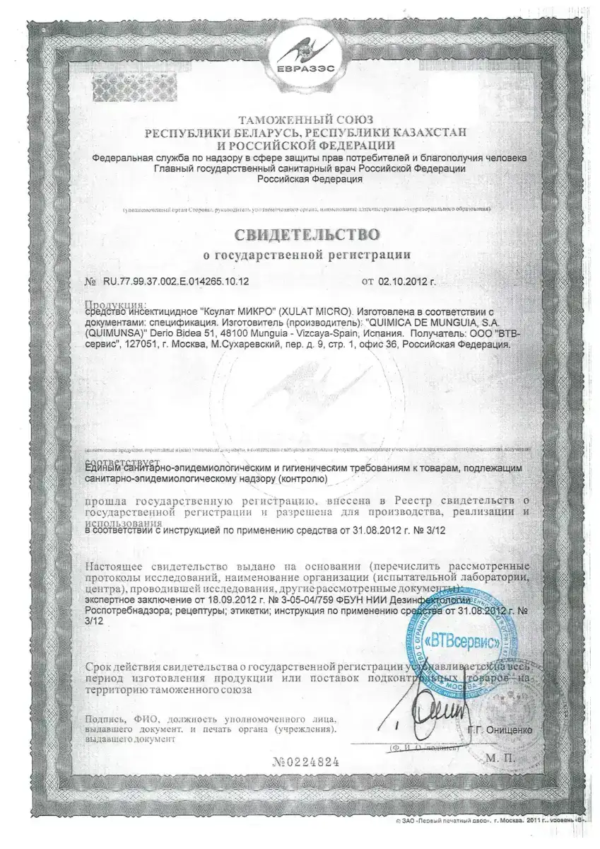 - Сертификаты на препараты. Профессиональное средство от кровососущих паразитов должно иметь свидетельство о государственной регистрации. Попросите показать документы до начала работ.