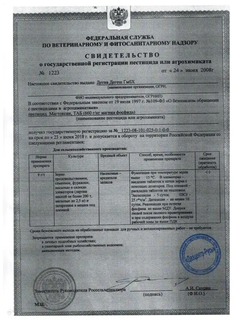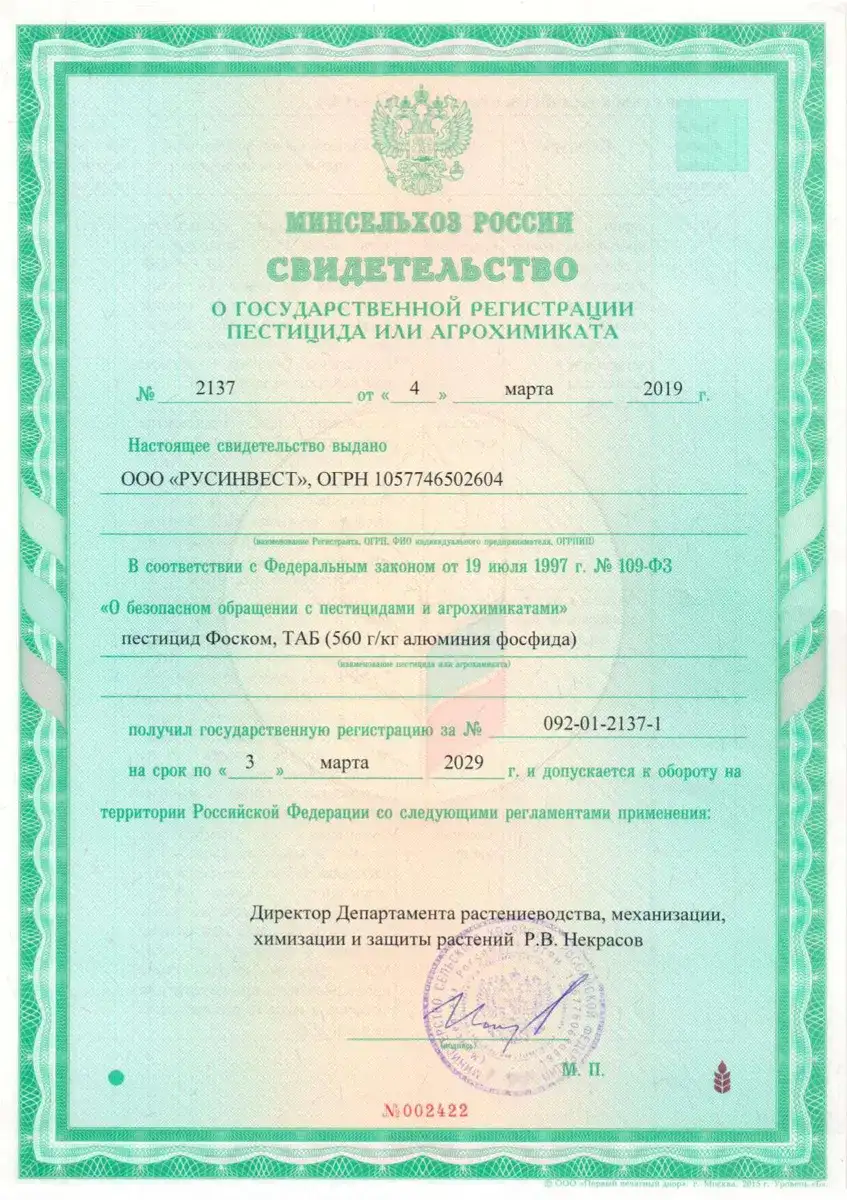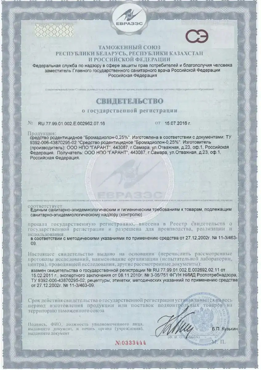 Компания работает только с официальными поставщиками антикоагулянтных приманок и газовых препаратов — каждая партия сопровождается свидетельством о государственной регистрации (СГР).