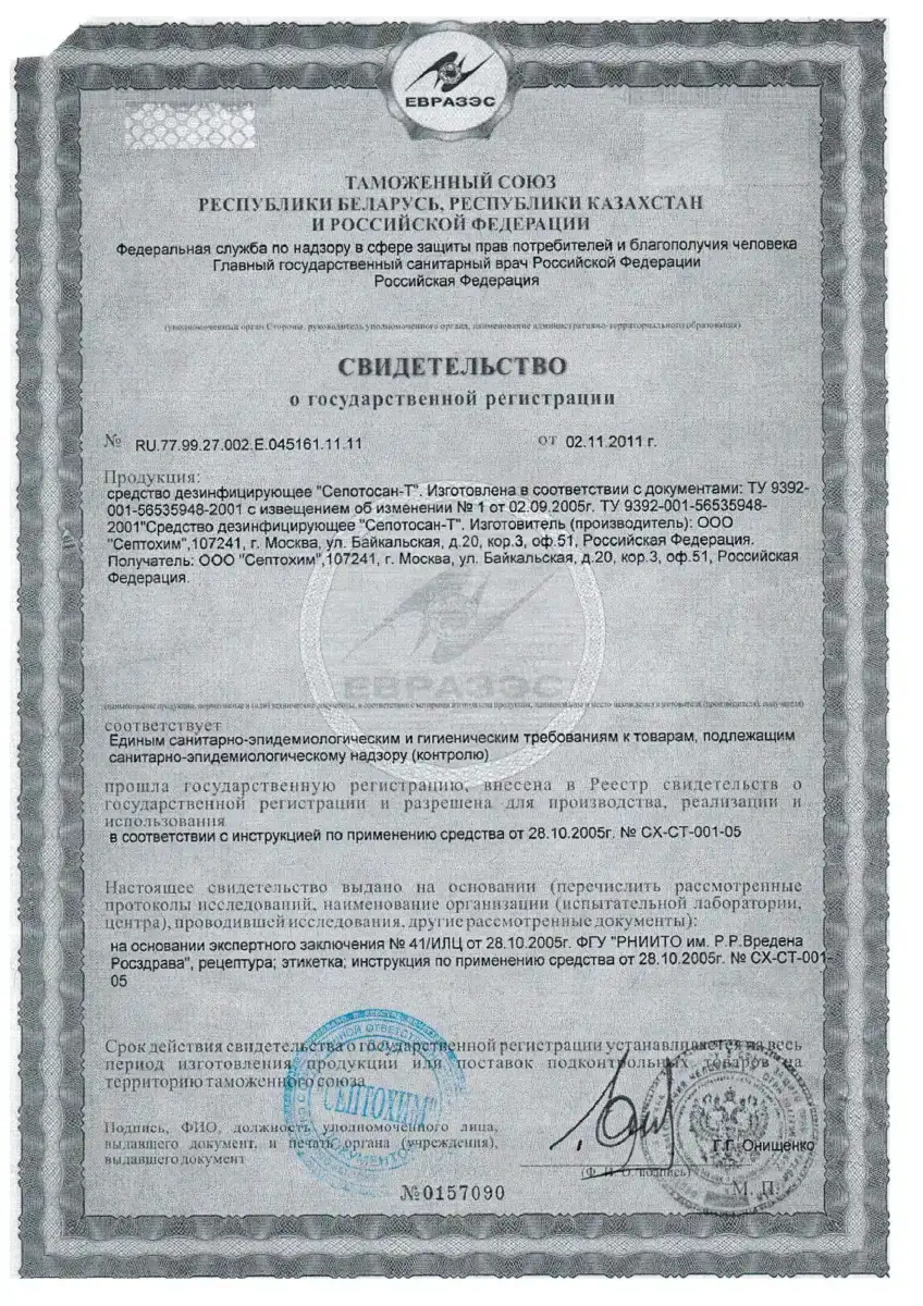 Компания работает только с официальными поставщиками: каждая партия средств для обеззараживания сопровождается свидетельством о государственной регистрации (СГР) и сертификатом соответствия — исключаем контрафактную продукцию.