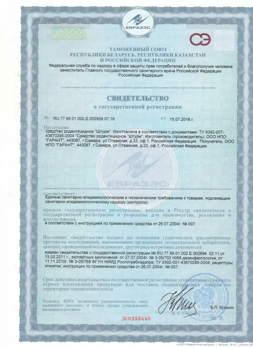 Компания работает только с официальными поставщиками антикоагулянтных приманок и газовых препаратов — каждая партия сопровождается свидетельством о государственной регистрации (СГР).