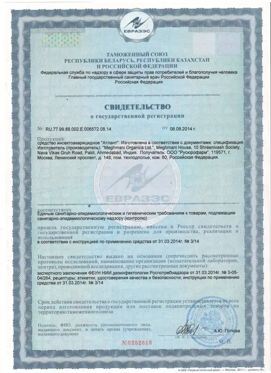 Компания закупает афидициды и контактно-кишечные средства только у официальных поставщиков — каждая партия сопровождается свидетельством о государственной регистрации и декларацией соответствия.